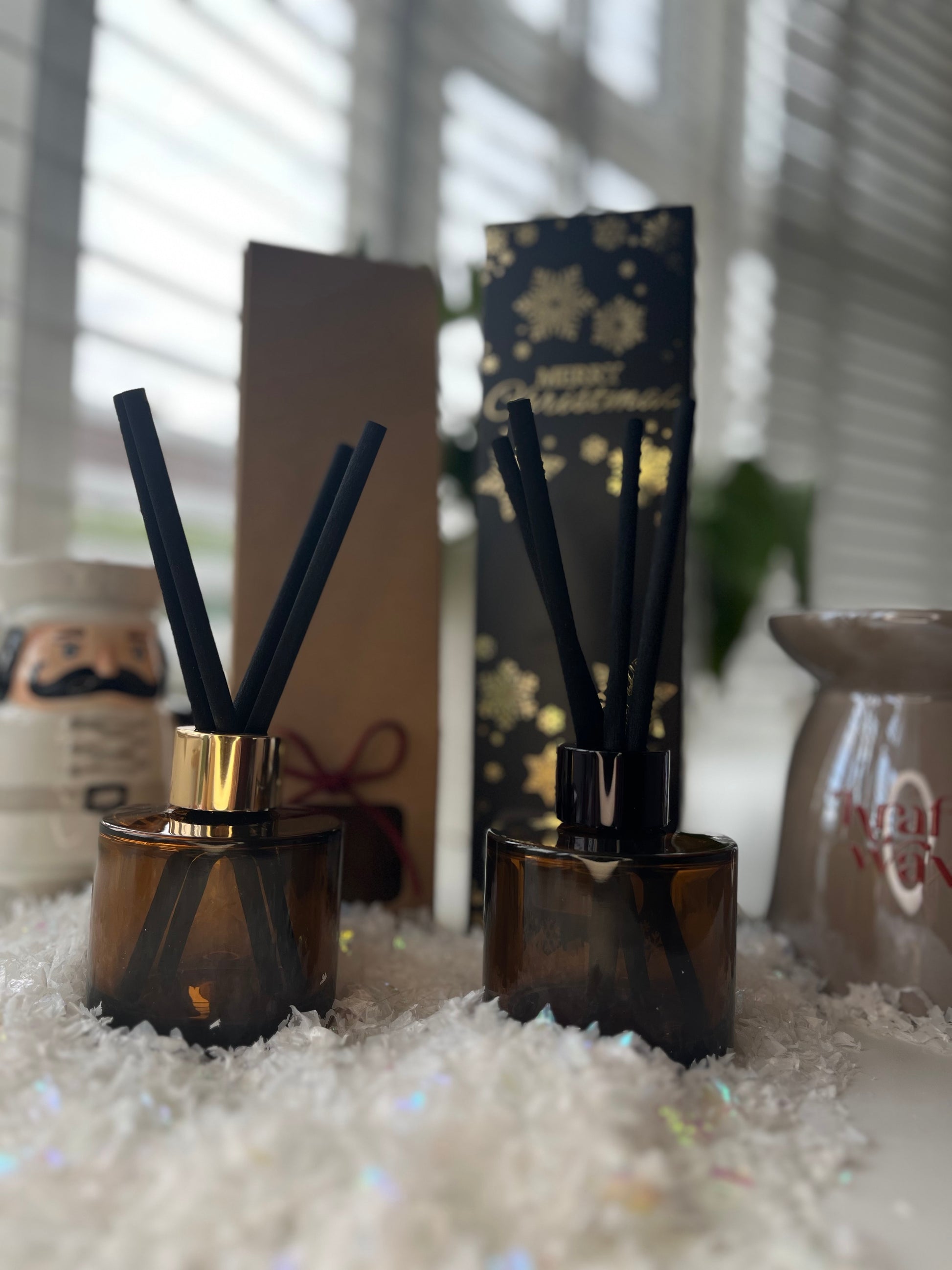 Winter Reed Diffusers - Premium Aromatic Fragrance for Cozy Home Atmosphere, made from the finest quality oils in amber jars with gold or black caps that come in 2 colour boxes