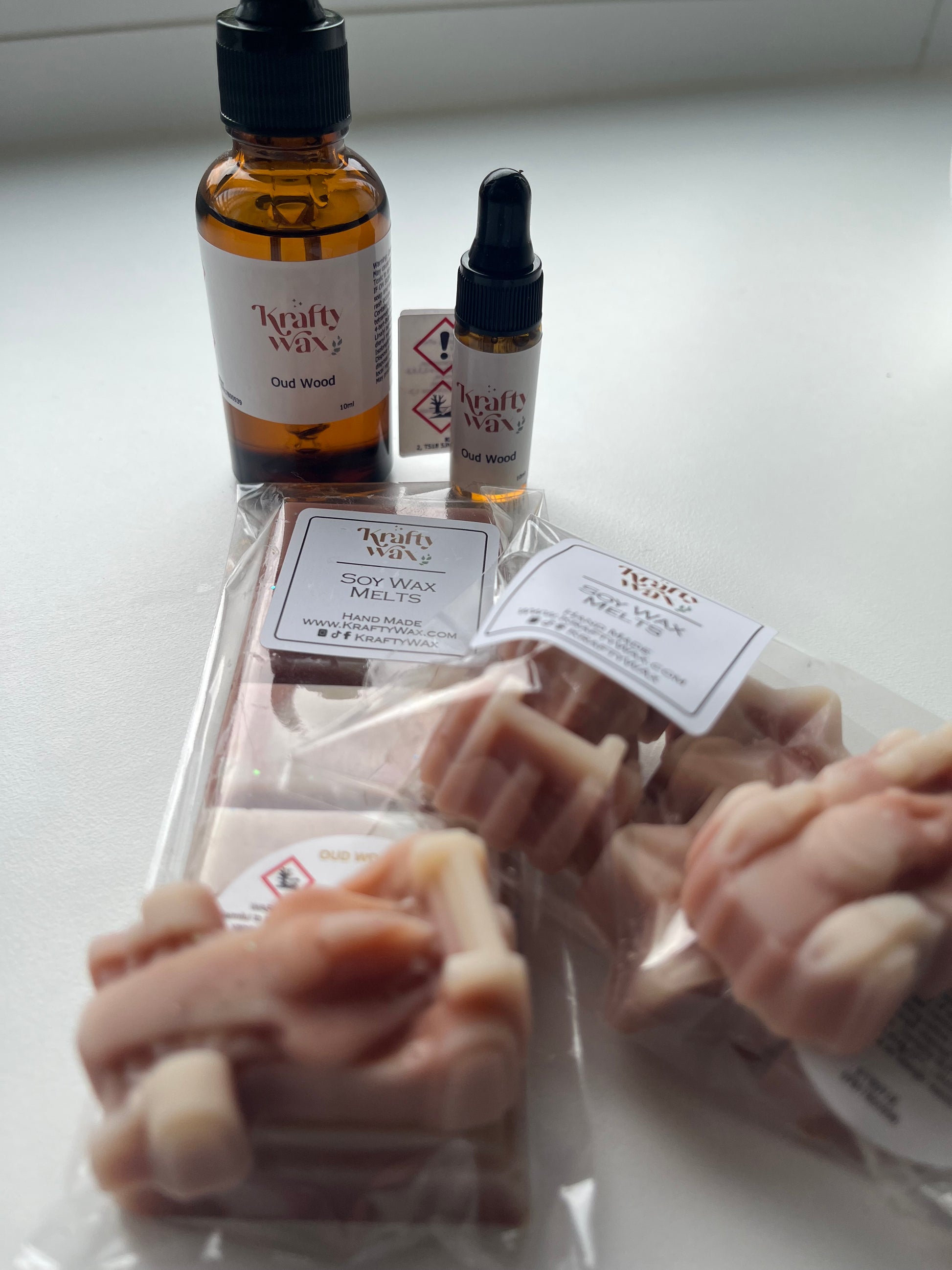 Kraftywax Oud Wood Scented Products offer a sophisticated woody fragrance that begins with spicy notes of cardamom and black pepper. The heart reveals a complex blend of oudh, frankincense, sandalwood, cedarwood, leather, patchouli, and vetiver, creating an enduring and rich aroma. This is balanced by a warm, sensuous base featuring amber, tonka, and vanilla, providing depth and elegance perfect for those seeking a distinguished and lasting scent experience.